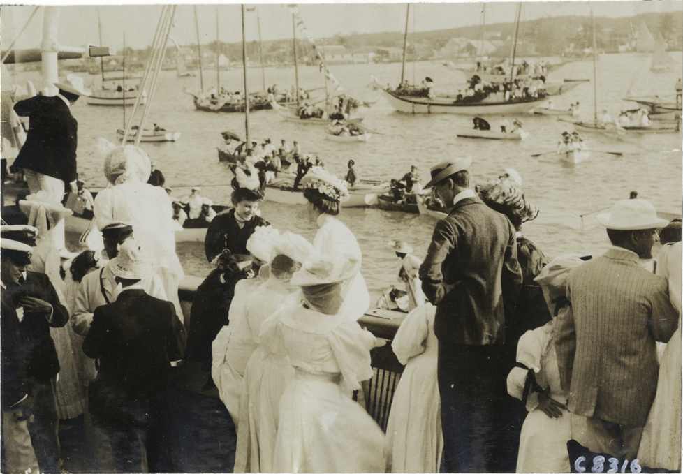 View of spectators watching regatta at Palm Beach boat carnival. Stamped on back: "Photo by N. Lazarnick, 29 West 42nd Street, New York." Handwritten on back: "Boats and boating--Palm Beach water boat carnival, 1905. Watching the regatta."