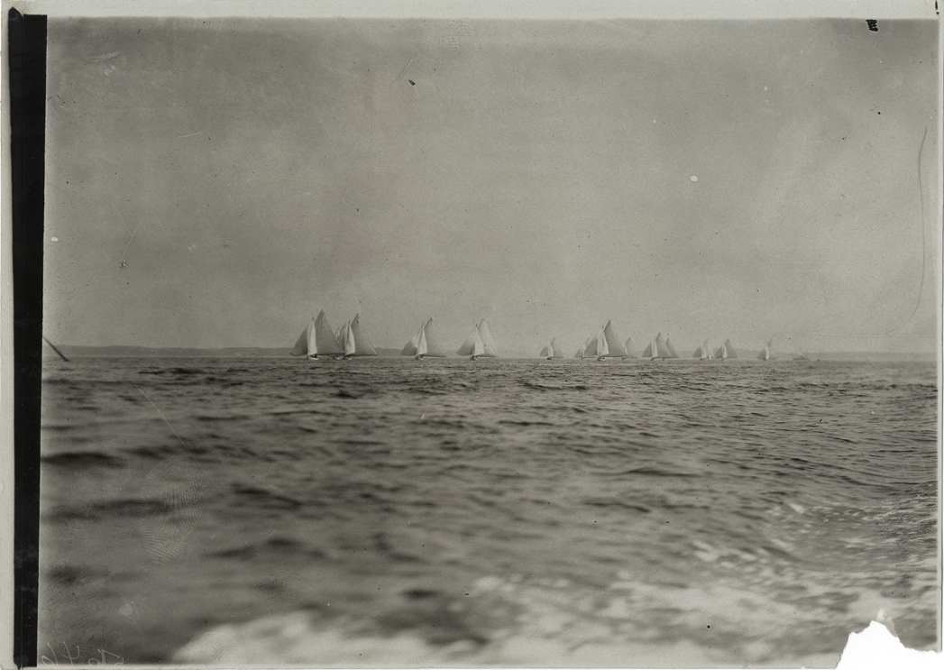 View of several sailboats at start of race. Handwritten on back: "Boats and boating, misc. Coming up to start."