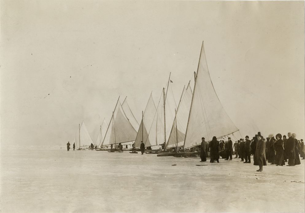 View of group of men and women standing near several ice boats on Lake St. Clair. Handwritten on back: "Boats and boating--Ice boating, Lake St. Clair, 1910."