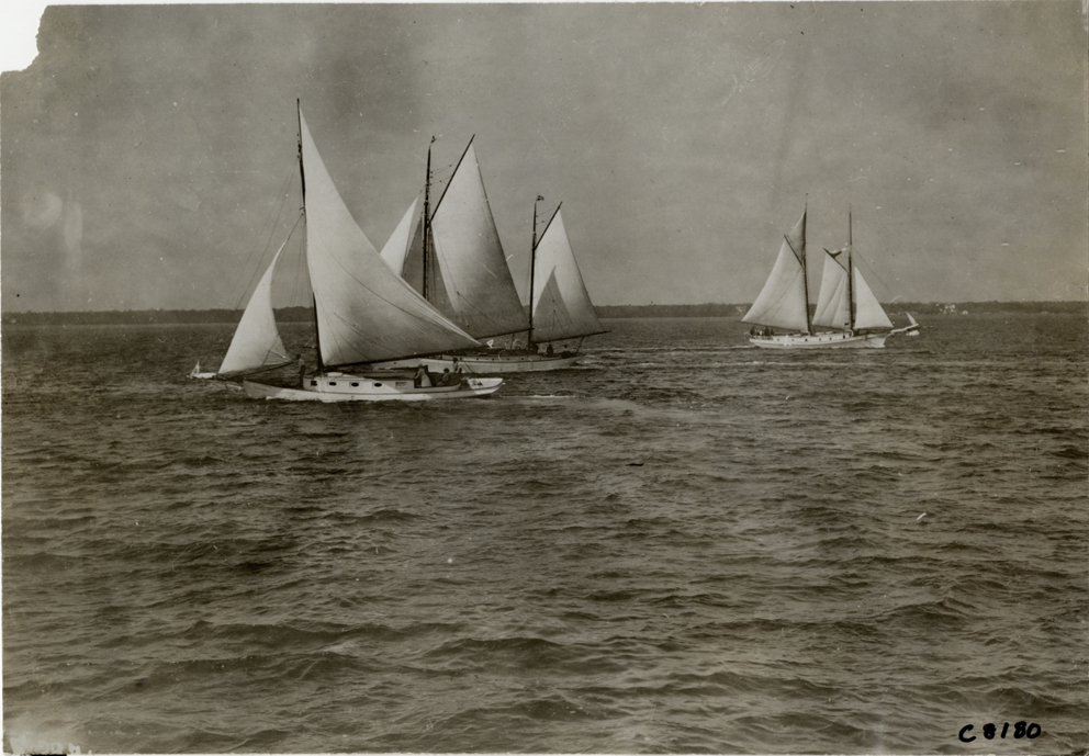 View of sailboats at start of Flag to Flag race to Miami, Palm Beach boat carnival. Stamped on back: "Photo by N. Lazarnick, 29 West 42nd Street, New York." Handwritten on back: "Boats and boating--Palm Beach water boat carnival, 1905. Start of the Flag to Flag race, Miami regatta."