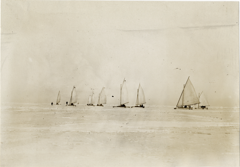 View of ice boats on Lake St. Clair. Handwritten on back: "Boats and boating--Ice boating, Lake St. Clair, 1910."