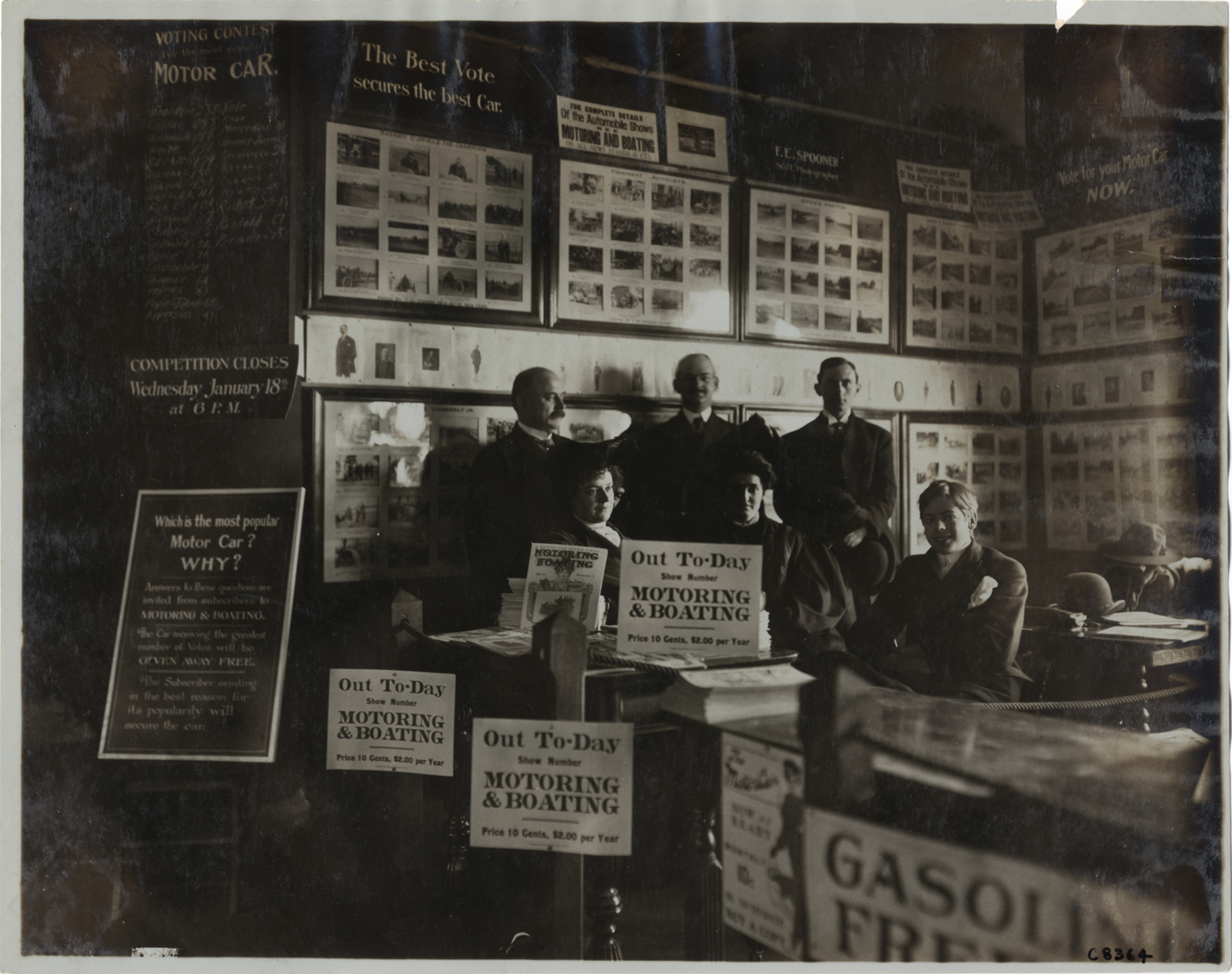View of men and women selling copies of the journal "Motoring & Boating." Signs in front of display read: "Out to-day, show number, Motoring & Boating, price 10 cents, $2.00 per year" and "What is the most popular motor car? Why?" Sheets of photographs displayed on walls. Handwritten on back: "Boats and boating--1905."