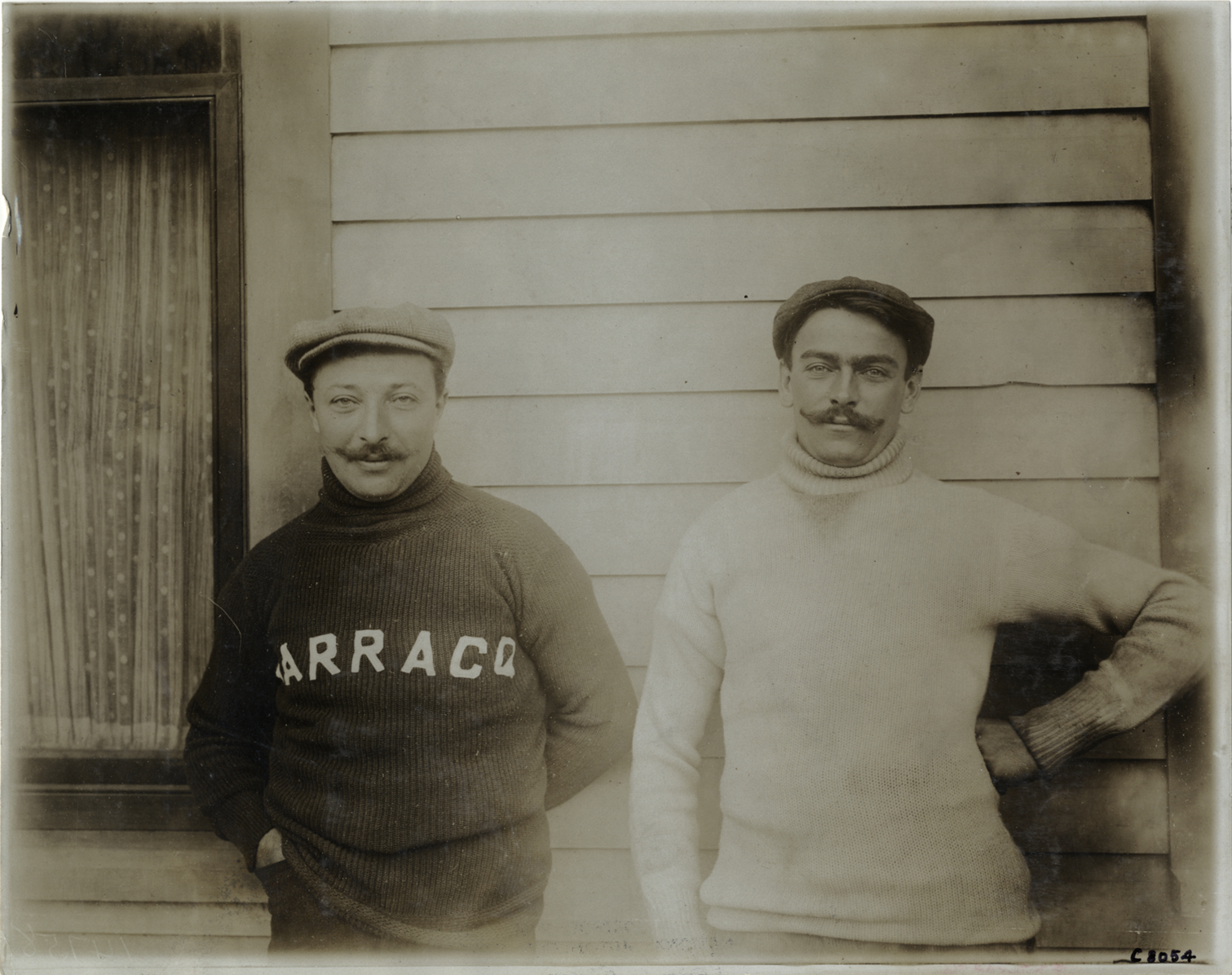 View of Louis Wagner and unidentified man standing in front of house. Handwritten on back: "Biography--Louis Wagner (right), 1906 Vanderbilt Cup driver."