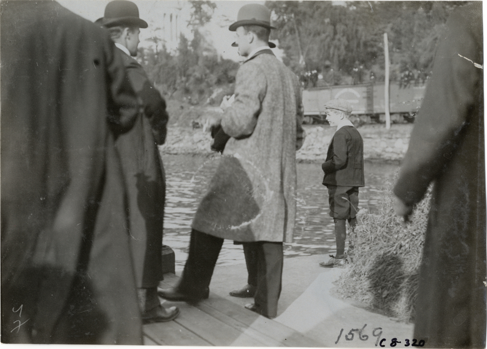 View of Frank Croker and men at auto boat races; boy stands at water's edge. Railroad cars in background. Handwritten on back: "Boats and boating, 1904. Spooner, Frank Croker."