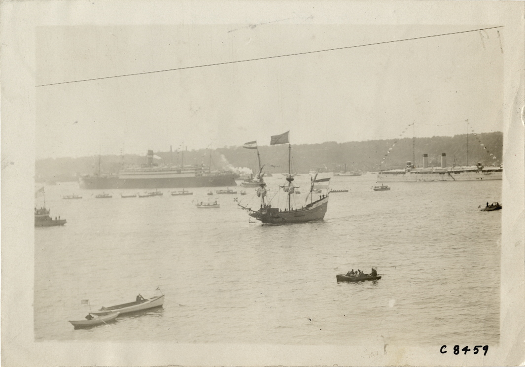 View of the sailing ship "Half Moon" during naval parade at Hudson-Fulton Celebration; steamships and other boats in background. Handwritten on back: "Boats and boating--Hudson-Fulton Celebration, naval parade, 1909."