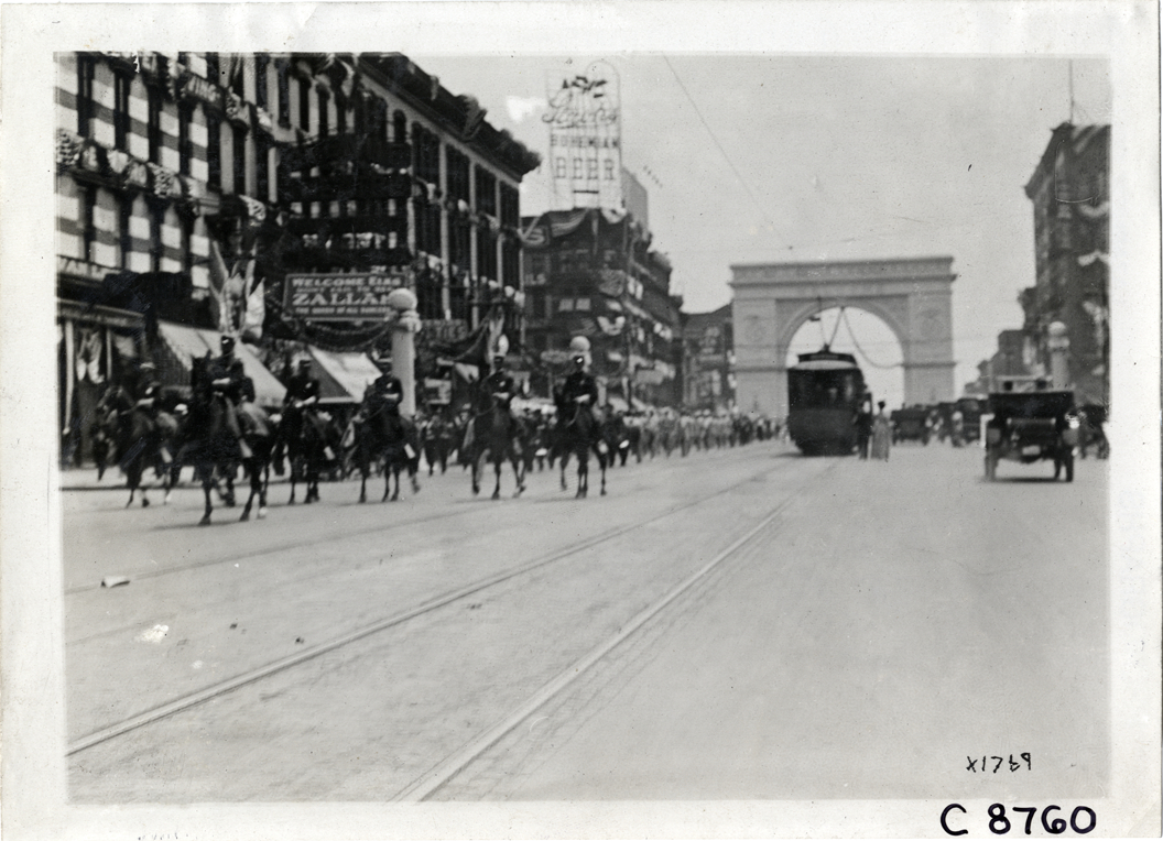 View of parade for Elks Club convention in Detroit, Michigan. Men on horseback in foreground; arch in background. Stamped on back: "Spooner & Wells, Inc., photographers, telephone North 1745. 1231 Woodward Ave., Detroit, Mich. Detroit, 1231 Woodward, New York, 1931 Broadway." Handwritten on back: "Conventions--Elks Club Convention, 1910. At Detroit."