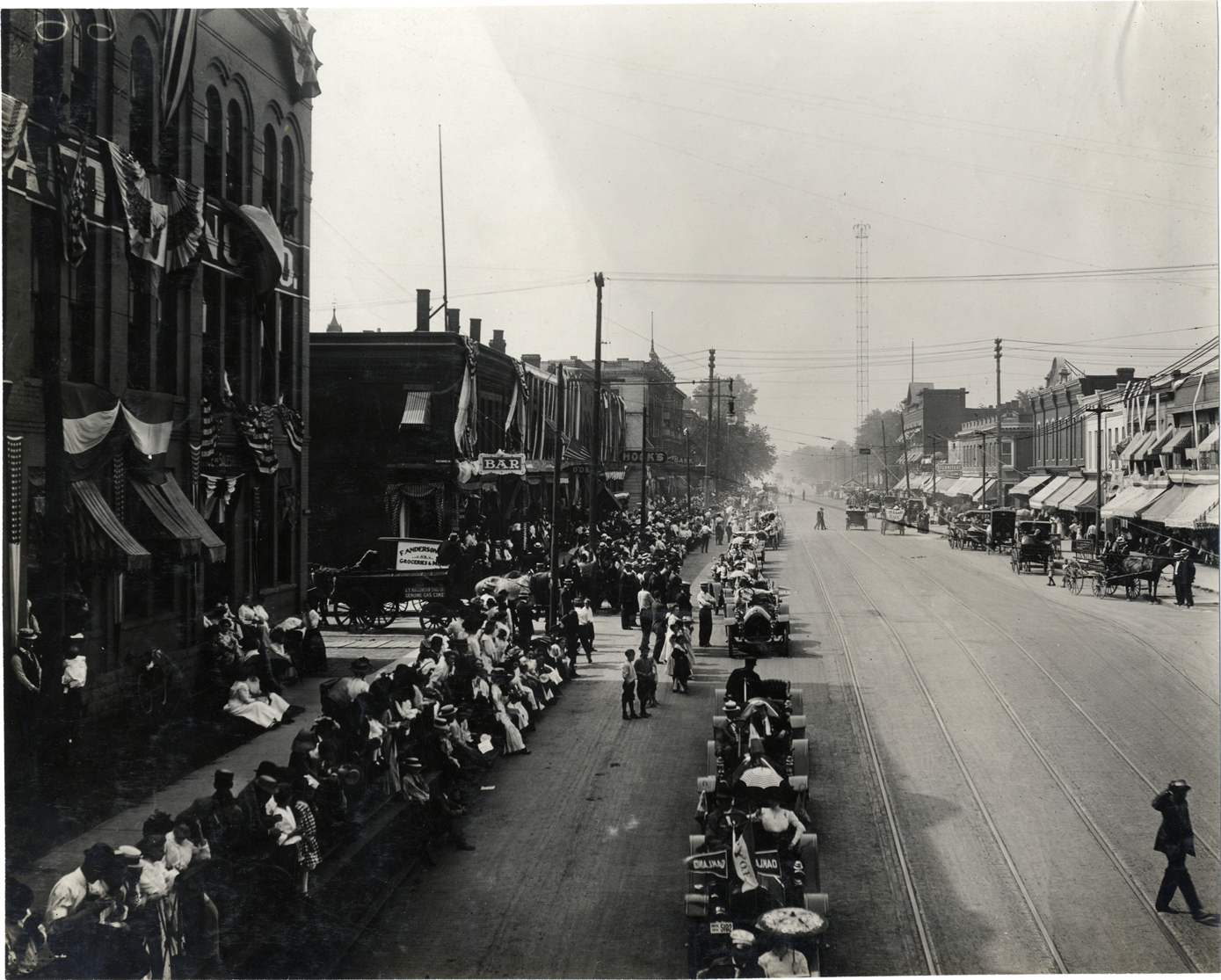 View of cars in parade during Elks Club convention in Detroit, Michigan. Spectators watch from sidewalks. Stamped on back: "Spooner & Wells, Inc., photographers, telephone North 1745. 1231 Woodward Ave., Detroit, Mich. Detroit, 1231 Woodward, New York, 1931 Broadway." Handwritten on back: "Conventions--Elks Club Convention, Detroit, Mi., 1910."