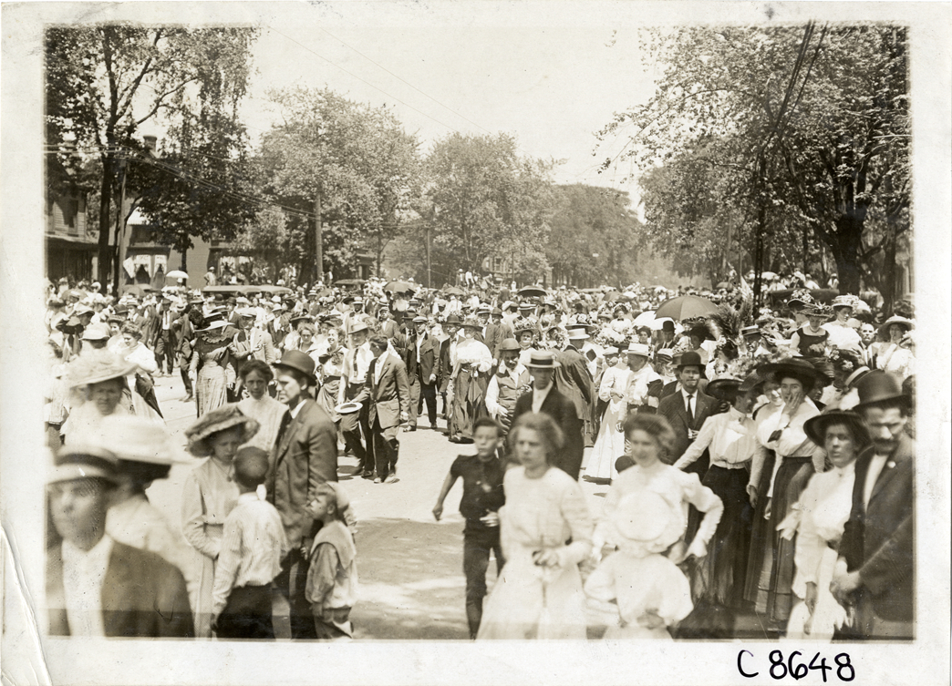 View of crowd at parade during Elks Club convention in Detroit, Michigan. Handwritten on back: "Conventions--Elks Club Convention, 1910. Detroit, Mi."