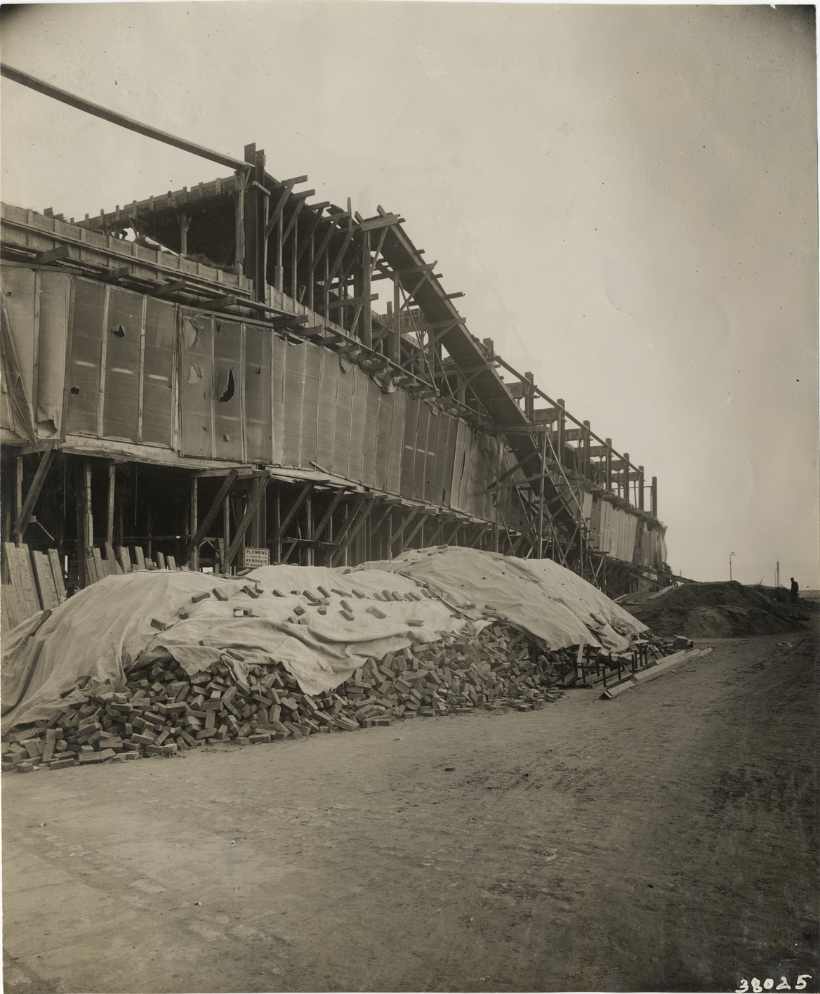 View of Ford Motor Company distributing plant and service depot under construction. Pile of bricks covered with tarpaulin in front of construction site. Stamped on back: "Spooner & Wells, Inc., photographers, telephones 3472-3473 Columbus, 1931 Broadway, New York." Handwritten on back: "Building construction, 1910."