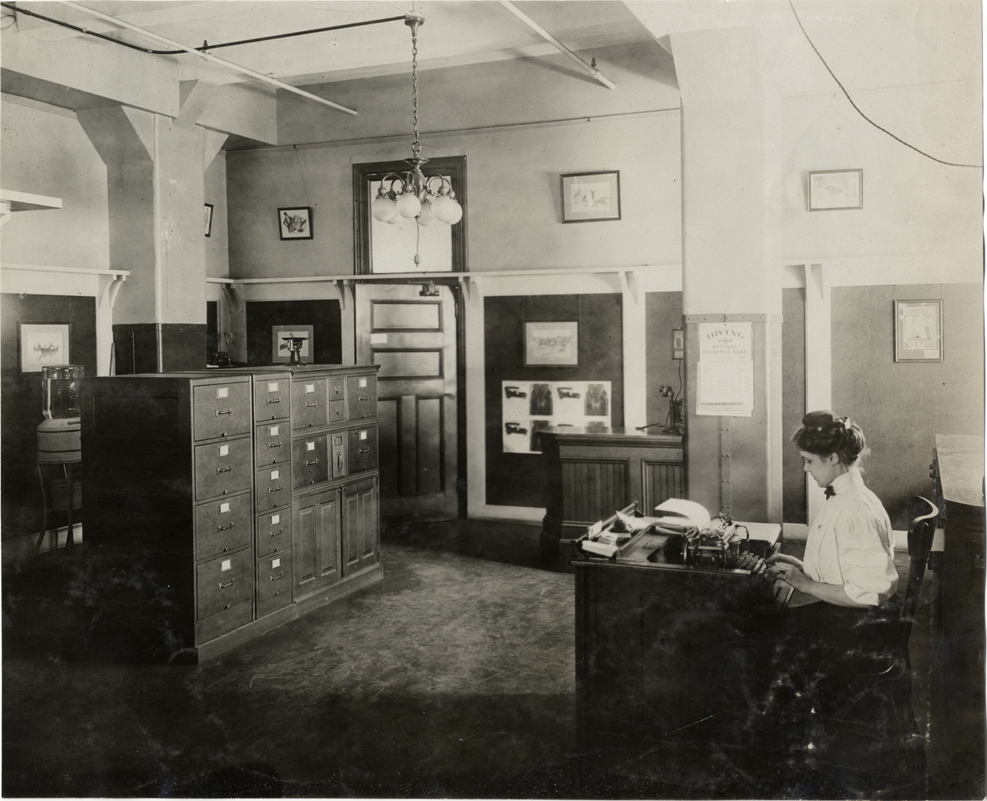 View of woman typing at desk in Life Magazine office. Room is furnished with typewriter, filing cabinets, water cooler and telephone. Handwritten on back: "Companies--Life Magazine, 1908. Life offices."