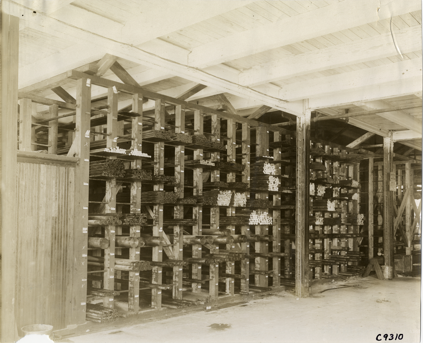 View of steel rods stacked in storage unit at Pittsburgh Shafting Company factory. Handwritten on back: "Factories--Pittsburgh Shafting Co., 1911."