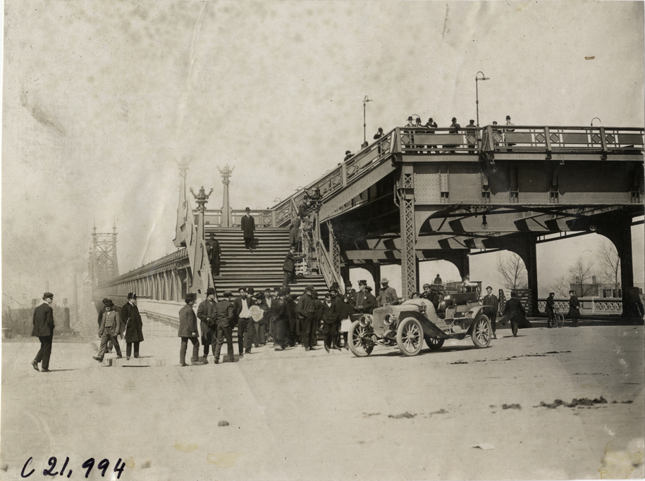 View of Lozier car and pedestrians at Queensboro Bridge. Stamped on back: "Spooner & Wells, Inc., photographers, telephones 3472-3473 Columbus, 1931 Broadway, New York." Handwritten on back: "Bridges--Queensboro Bridge, 1909, folder #1. Lozier."