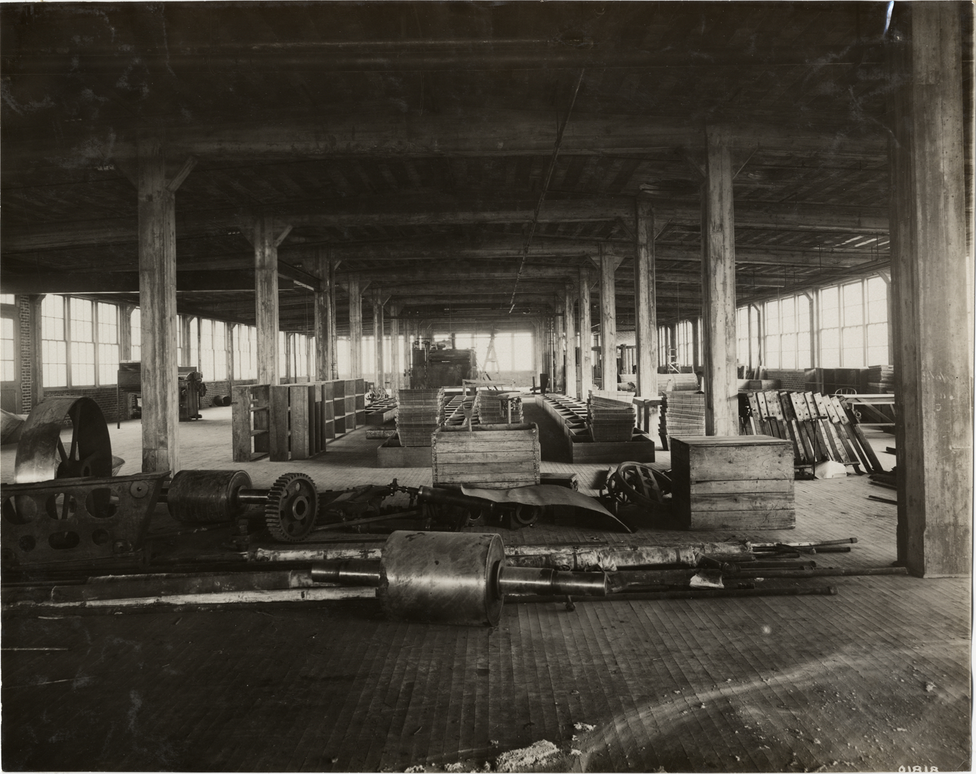 View of interior of Bagley Tobacco Company factory; machinery parts in foreground; wooden shelves, pallets, crates and bins in background. Handwritten on back: "Companies, Bagley Tobacco Co., Detroit, Mi., 1910. Bagley Ave."