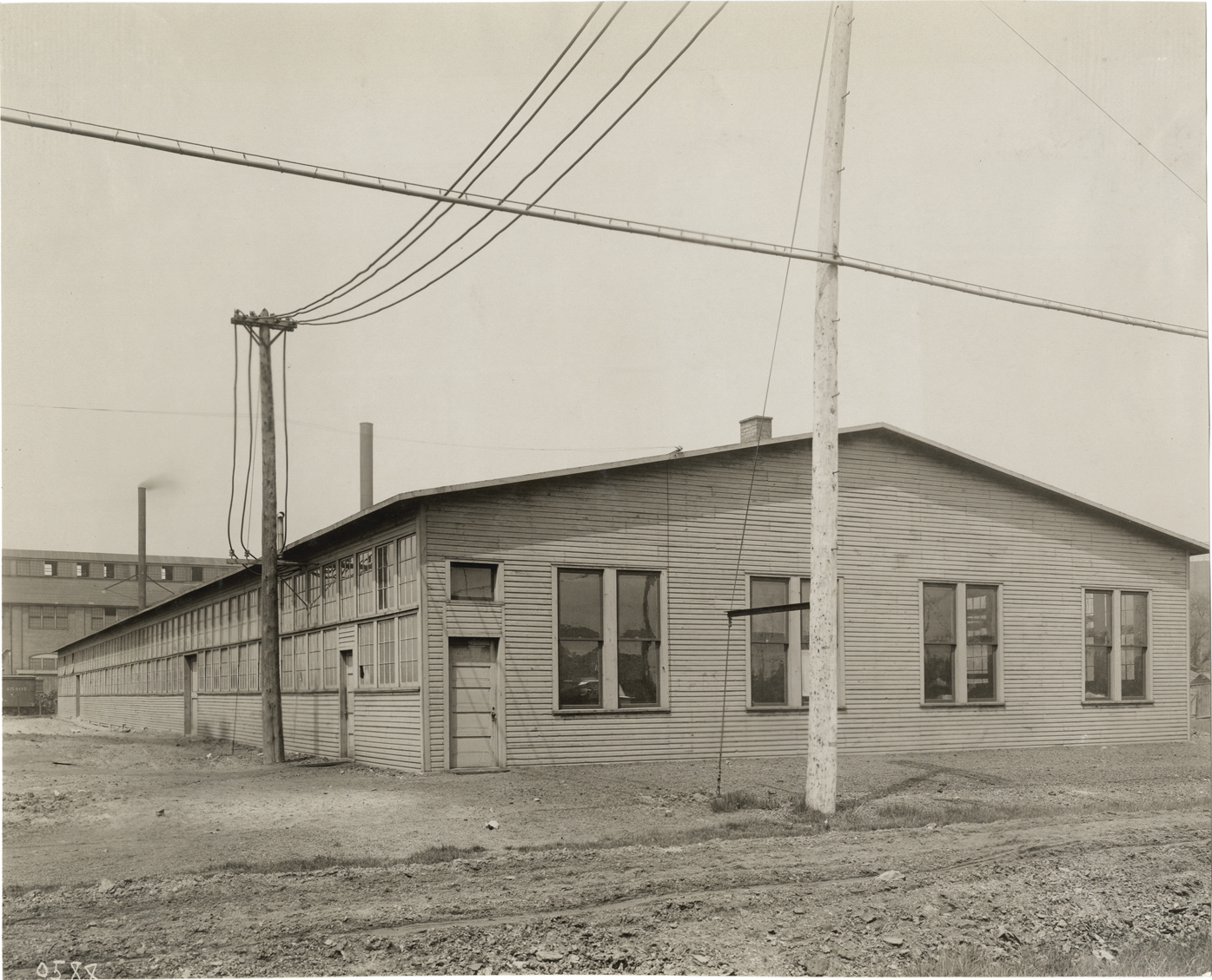 View of wooden-frame building at Sibley Motor Car Company factory. Handwritten on back: "Companies--Sibley Motor Car Co., 1910. Sibley factory."