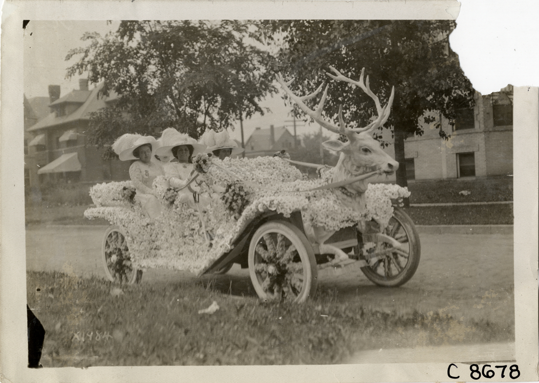 View of women sitting in car for parade during Elks Club convention in Detroit, Michigan. Car is decorated with elk head and covered with floral decorations. Stamped on back: "Spooner & Wells, Inc., photographers, telephone North 1745. 1231 Woodward Ave., Detroit, Mich. Detroit, 1231 Woodward, New York, 1931 Broadway." Handwritten on back: "Conventions--Elks Club Convention, 1910. Detroit, Mi."