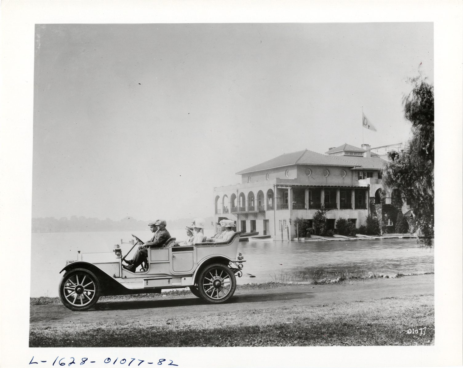 View of motorists in 1910 Chalmers car in front of Detroit Boat Club building. Handwritten on back: "Chalmers, 1910. Detroit River, Belle Isle."
