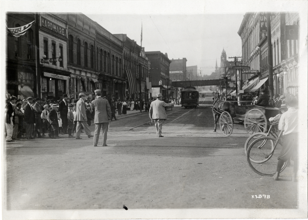 View of street in Marquette during Detroit Board of Commerce Eighth Annual Cruise to Hancock, Houghton and Marquette, Michigan. Several men stand in center of street; streetcar in background. Handwritten on back: "Conventions--Detroit Board of Commerce, Eighth Annual Cruise, 1911."