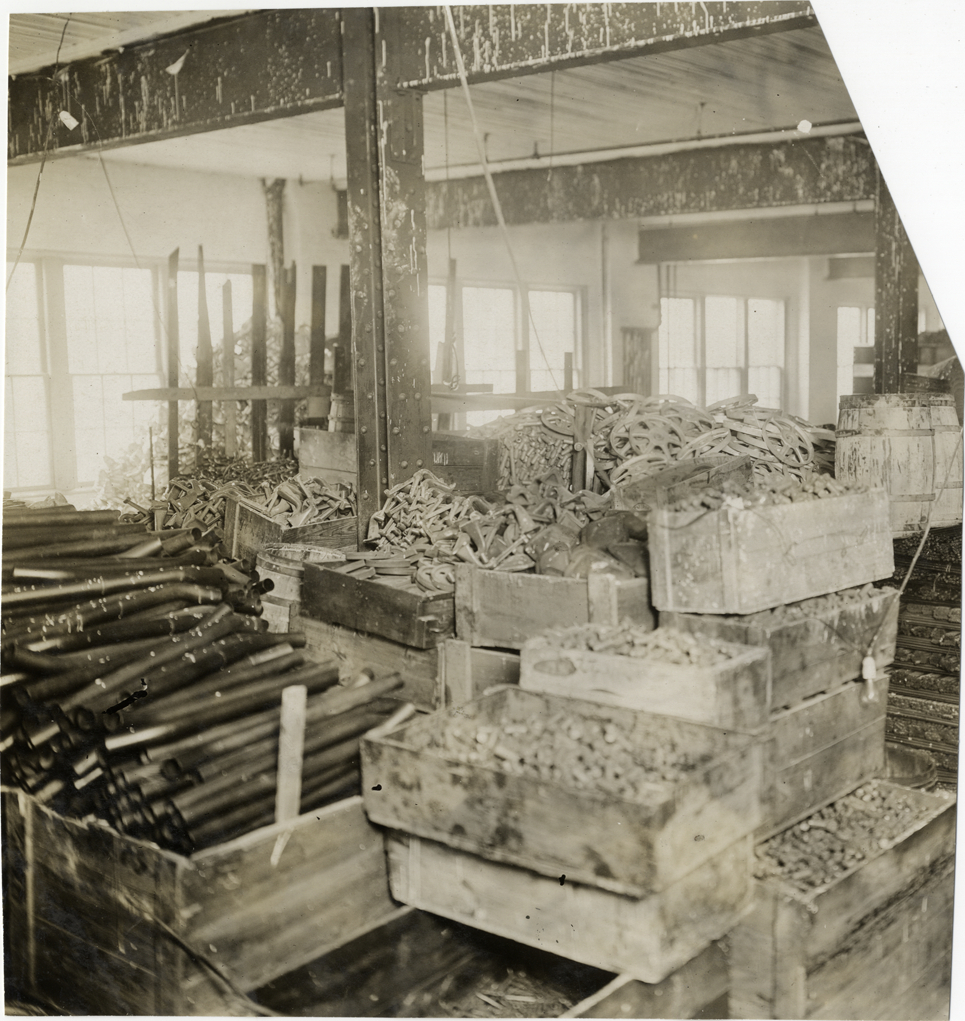 View of stacks of automotive parts inside E-M-F Company factory. Handwritten on back: "Companies--E-M-F, 1910."