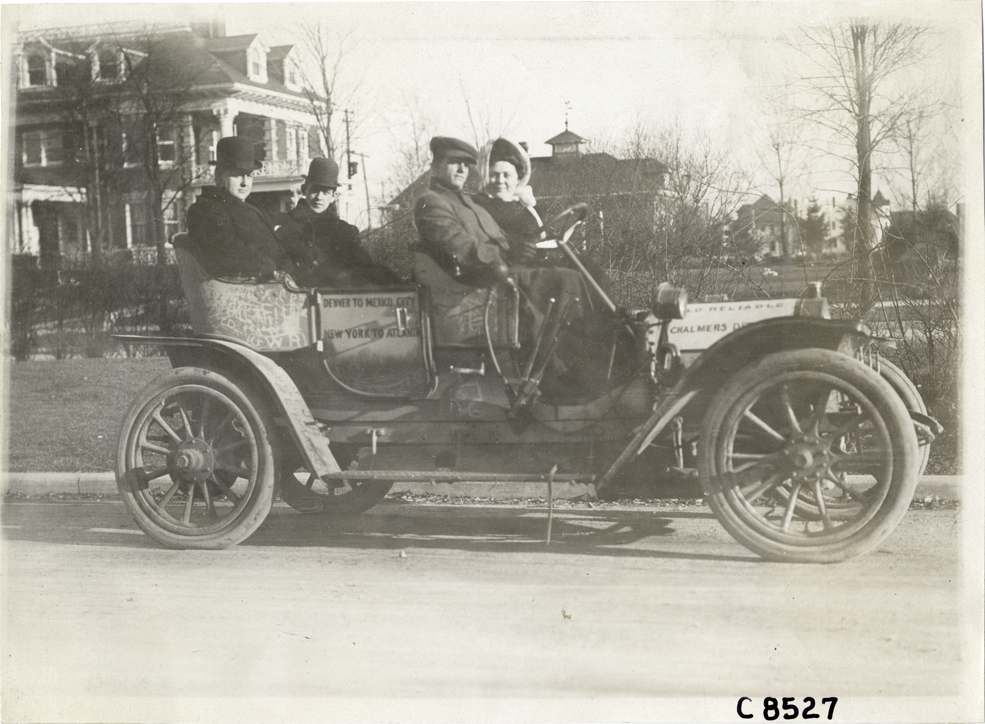 View of motorists in 1910 Chalmers car. Painted on rear door: "Denver to Mexico City. New York to Atlanta." Houses in background. Handwritten on back: "Chalmers, 1910."