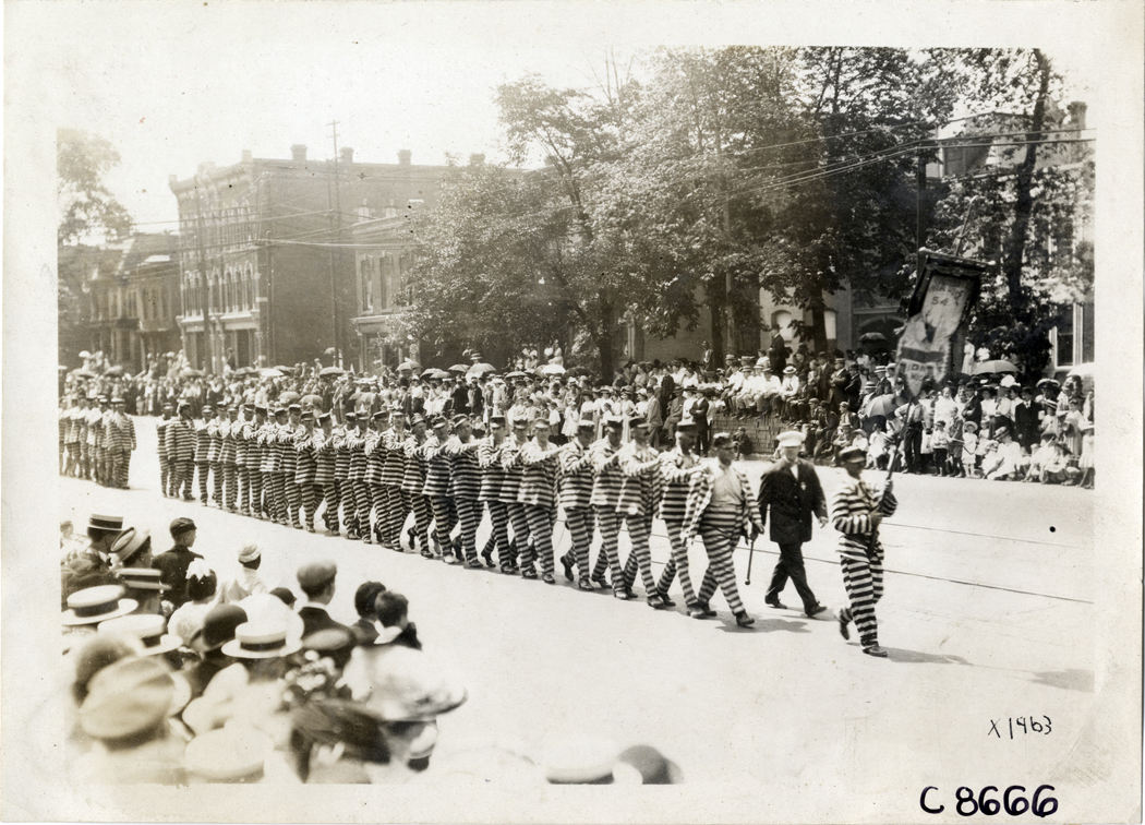 View of Ionia, Michigan Elks lodge marching in parade during Elks Club convention in Detroit, Michigan; men march in single file and wear striped prison uniforms. Handwritten on back: "Conventions--Elks Club Convention, 1910. Detroit, Mi."