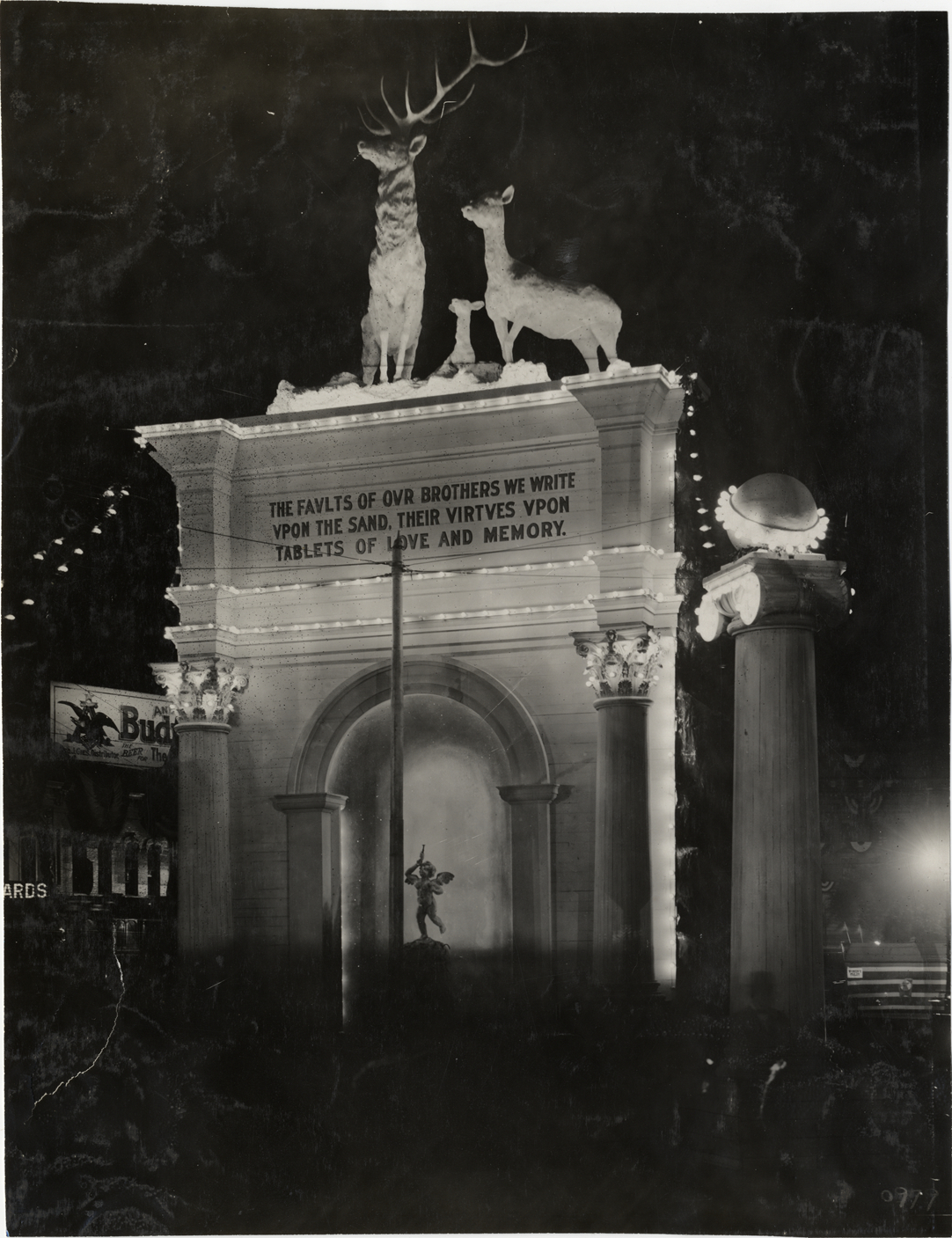 Nighttime view of illuminated monument for Elks Club convention, Detroit, Michigan. Monument is decorated with columns, statues of elk and statue of cupid in niche. Inscribed on monument: "The faults of our brothers we write upon the sand. Their virtues upon tablets of love and memory." Stamped on back: "Spooner & Wells, Inc., photographers, telephone North 1745. 1231 Woodward Ave., Detroit, Mich. Detroit, 1231 Woodward, New York, 1931 Broadway." Handwritten on back: "Conventions--Elks Club Convention, Detroit, Mi., 1910."