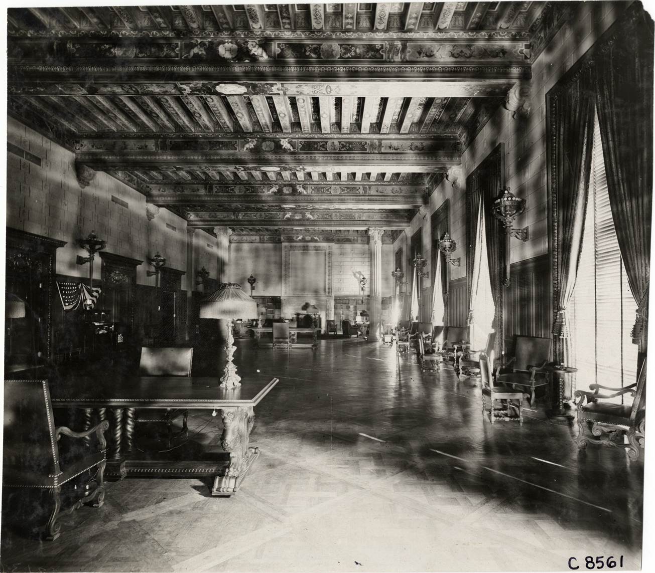 View of assembly hall in Automobile Club of America building. Room is furnished with tables, chairs and lamps. Decorated ceiling beams overhead; room has parquet floor. Handwritten on back: "Clubs-Automobile Club of America, interior, 1908."