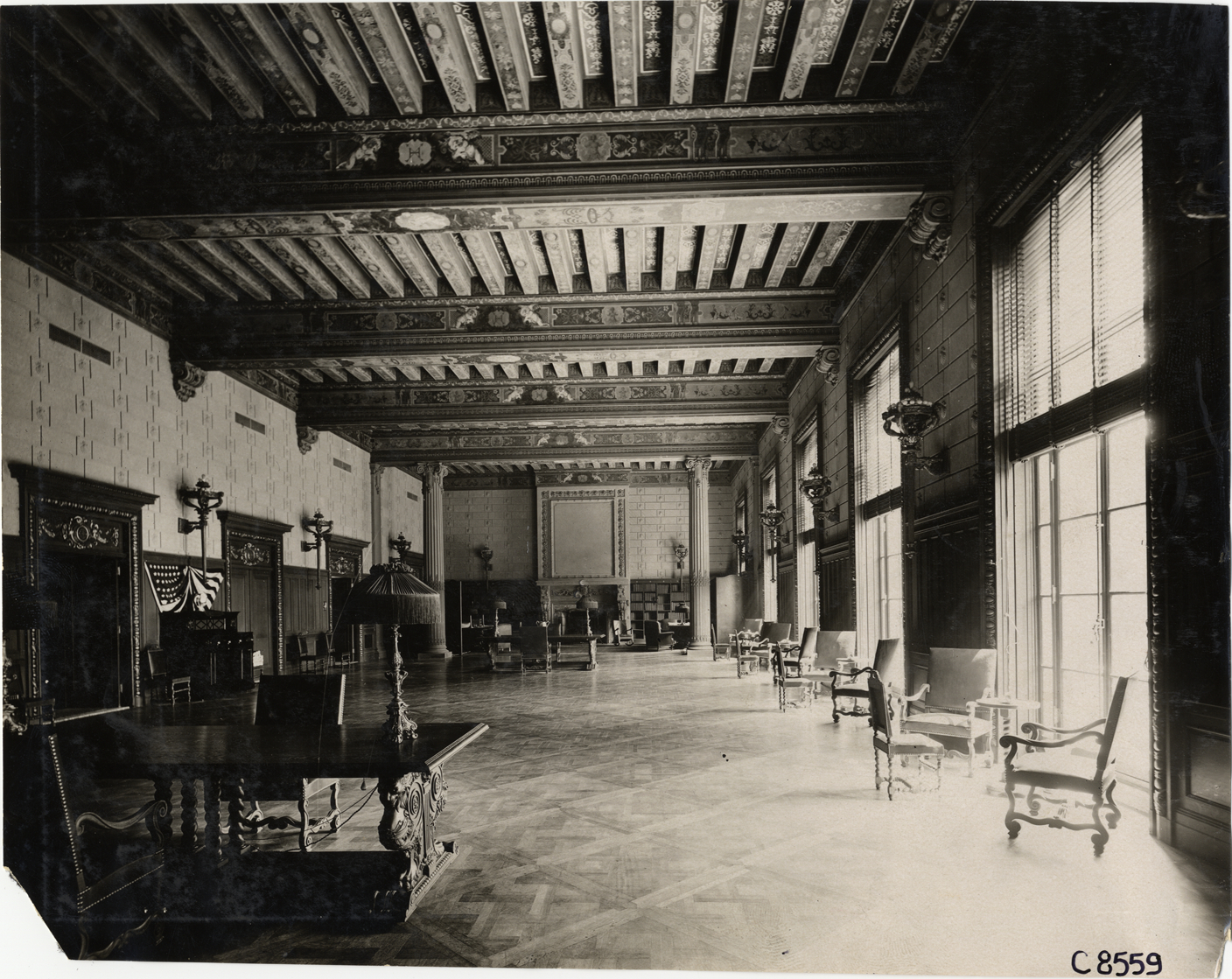 View of assembly hall in Automobile Club of America building. Room is furnished with tables, chairs and lamps. Decorated ceiling beams overhead; room has parquet floor. Handwritten on back: "Clubs-Automobile Club of America, interior, 1908."