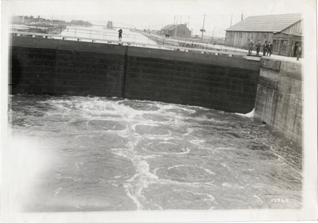 View of Soo Locks during Detroit Board of Commerce Eighth Annual Cruise to Hancock, Houghton and Marquette, Michigan. Man leans over railing at top of gate. Stamped on back: "Spooner & Wells, Inc., photographers, 1231 Woodward Ave., Detroit, Mich., telephone North 1745." Handwritten on back: "Conventions--Detroit Board of Commerce, Eighth Annual Cruise, 1911."