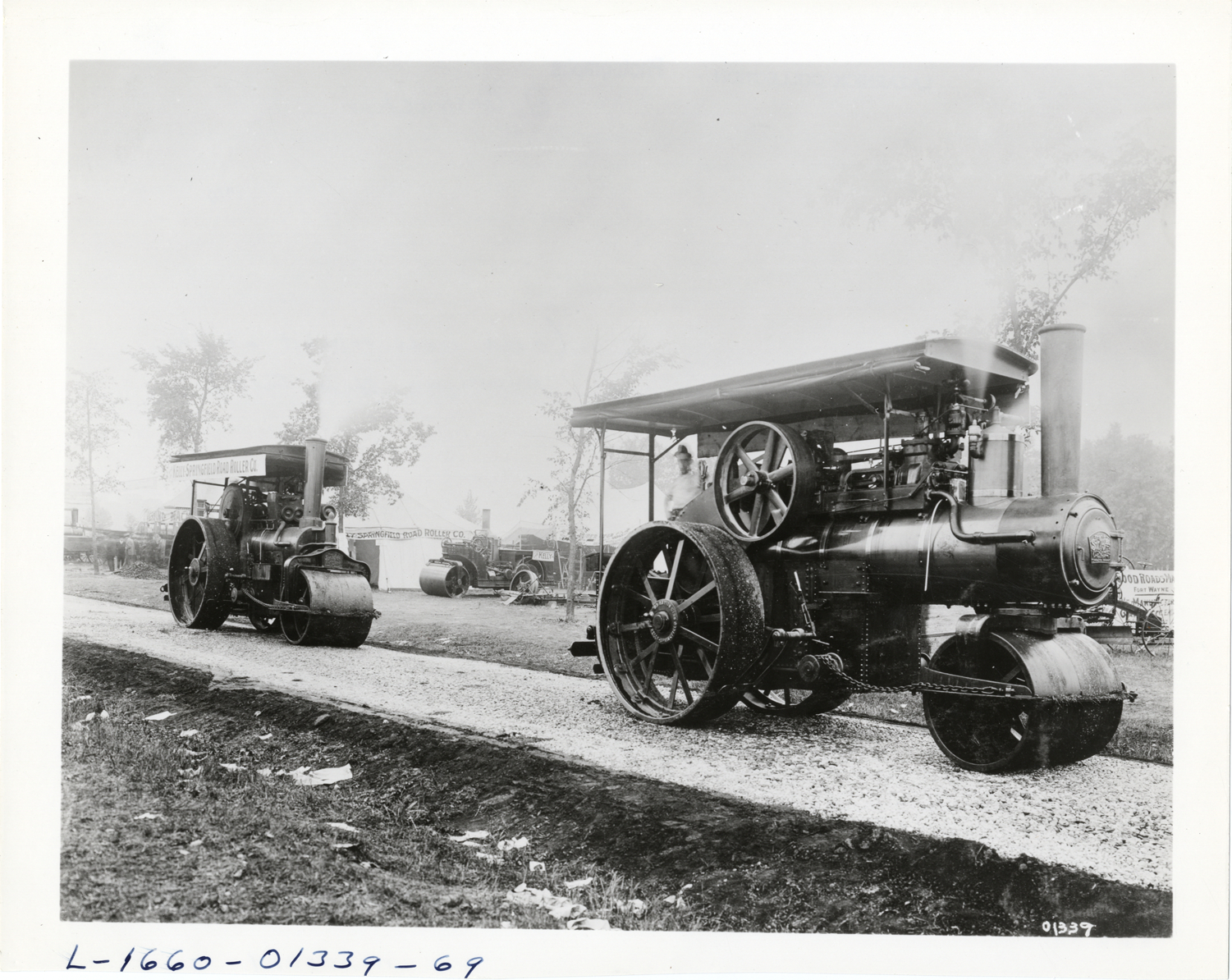 View of steamrollers from Springfield Road Roller Company at Good Roads exhibit, Michigan State Fair. Handwritten on back: "Construction, 1910. Good Roads exhibit at the Michigan State Fair."