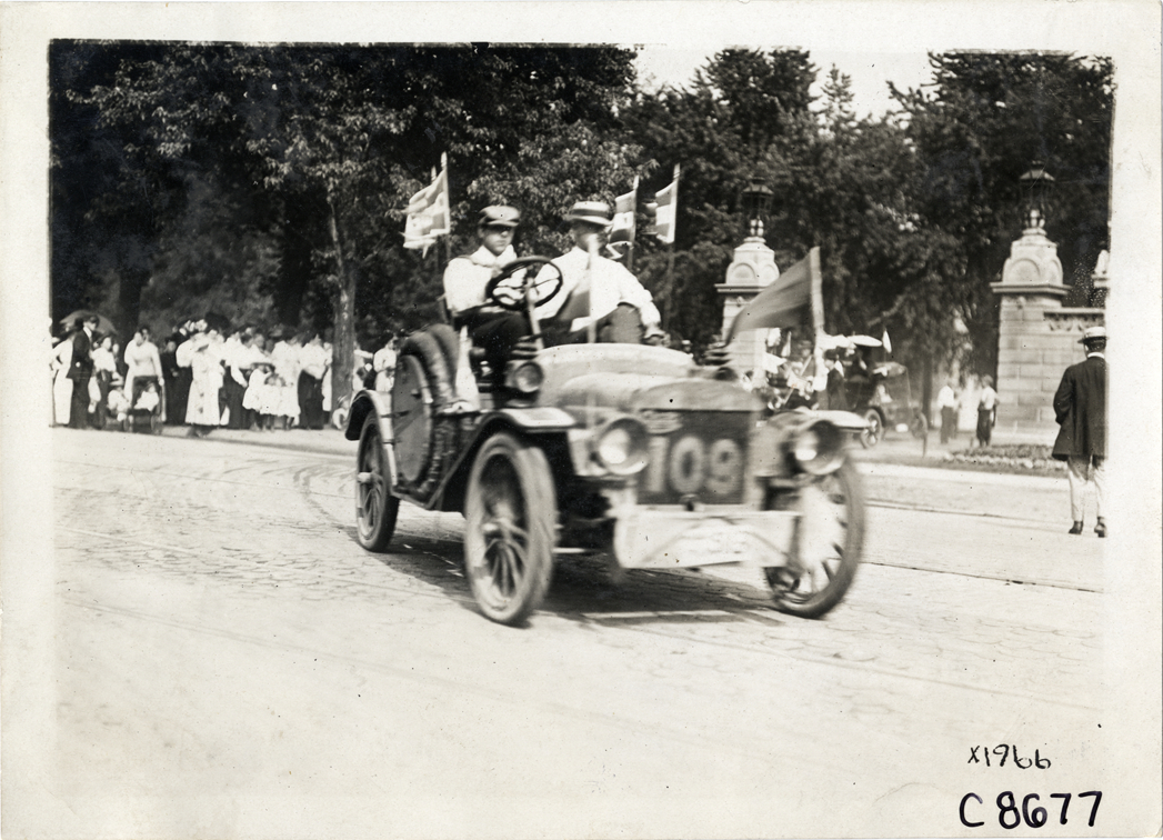 View of car in parade during Elks Club convention in Detroit, Michigan. Car is decorated with flags; "109" on front grille. Stamped on back: "Spooner & Wells, Inc., photographers, telephone North 1745. 1231 Woodward Ave., Detroit, Mich. Detroit, 1231 Woodward, New York, 1931 Broadway." Handwritten on back: "Conventions--Elks Club Convention, 1910. Detroit, Mi."