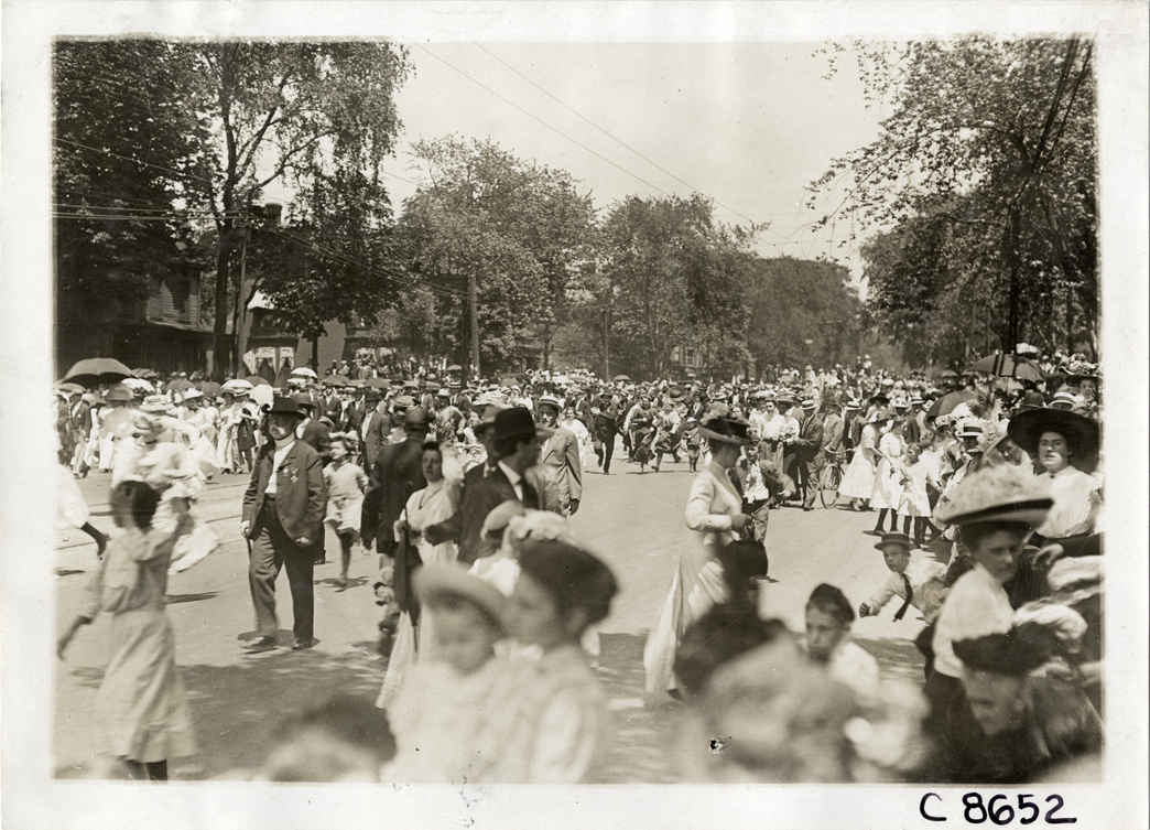 View of crowd at parade during Elks Club convention in Detroit, Michigan. Handwritten on back: "Conventions--Elks Club Convention, 1910. Detroit, Mi."