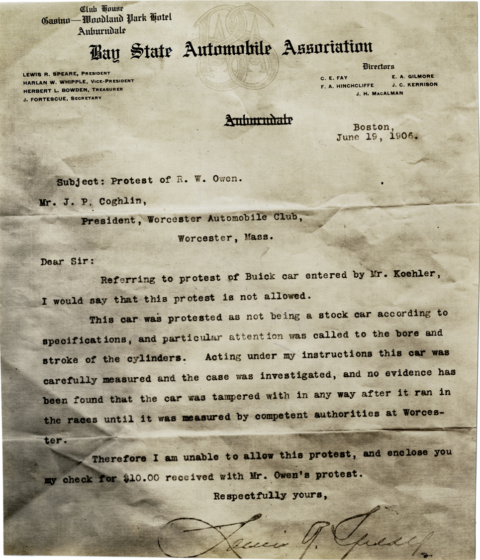 Photograph of letter from Lewis R. Speare, president of the Bay State Automobile Association to J.P Coughlin, president of the Worcester Automobile Club. Letter refers to protest of R.W. Owen of Buick car entered in race by Mr. Koehler. Owen claimed that said car was not a stock car according to specifications. Speare indicates that the investigation shows that this is not the case and disallows the protest. Handwritten on back: "Correspondence, 1906."