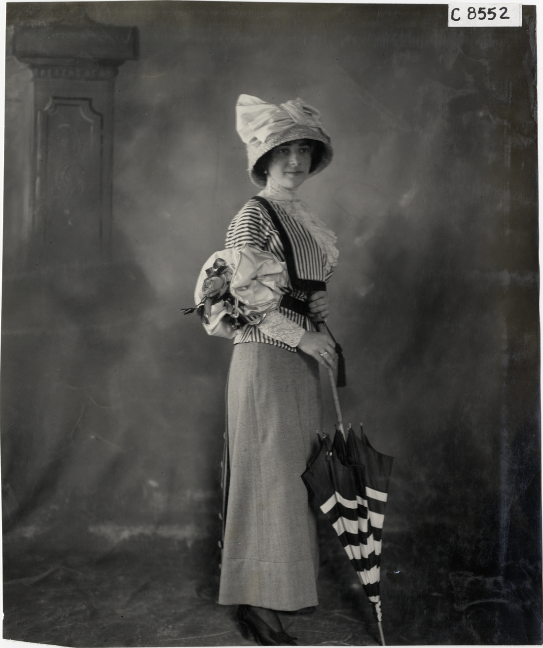 Studio portrait of woman wearing hat, striped blouse and holding umbrella, standing in front of painted backdrop. Stamped on back: "Spooner & Wells, Inc., photographers, telephones 3472-3473 Columbus, 1931 Broadway, New York." Handwritten on back: "Clothing, 1911."