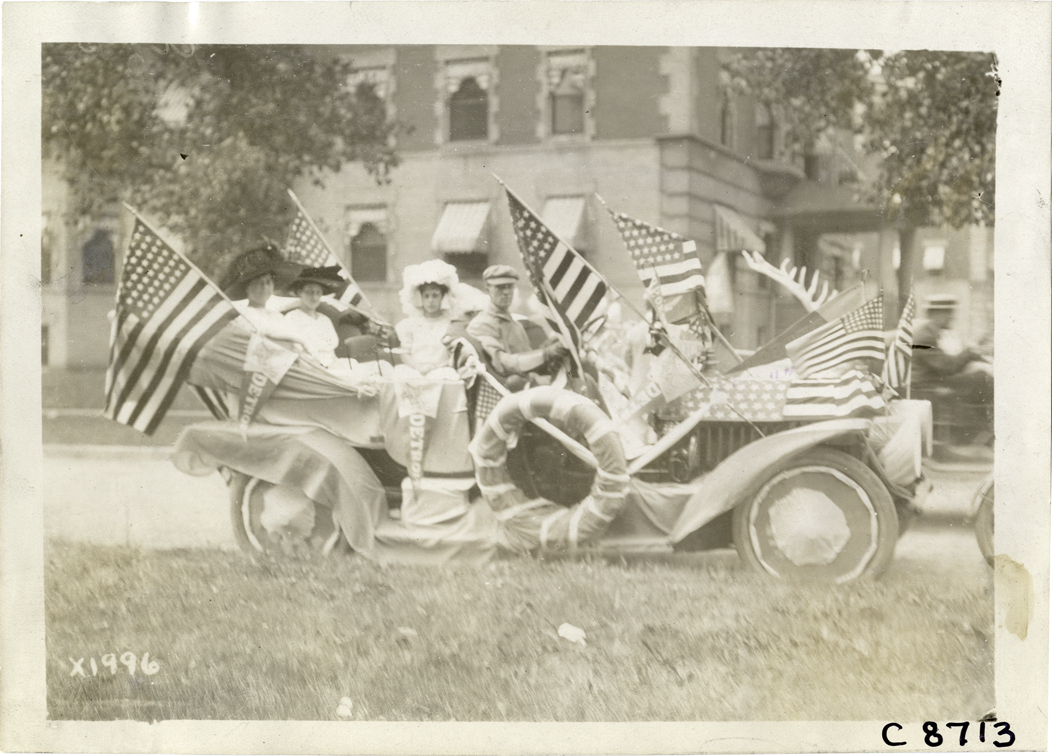 View of car in parade during Elks Club convention in Detroit, Michigan. Car is decorated with American flags, Detroit pennants and elk head. Stamped on back: "Spooner & Wells, Inc., photographers, telephone North 1745. 1231 Woodward Ave., Detroit, Mich. Detroit, 1231 Woodward, New York, 1931 Broadway." Handwritten on back: "Conventions--Elks Club Convention, 1910. Detroit, Mi."