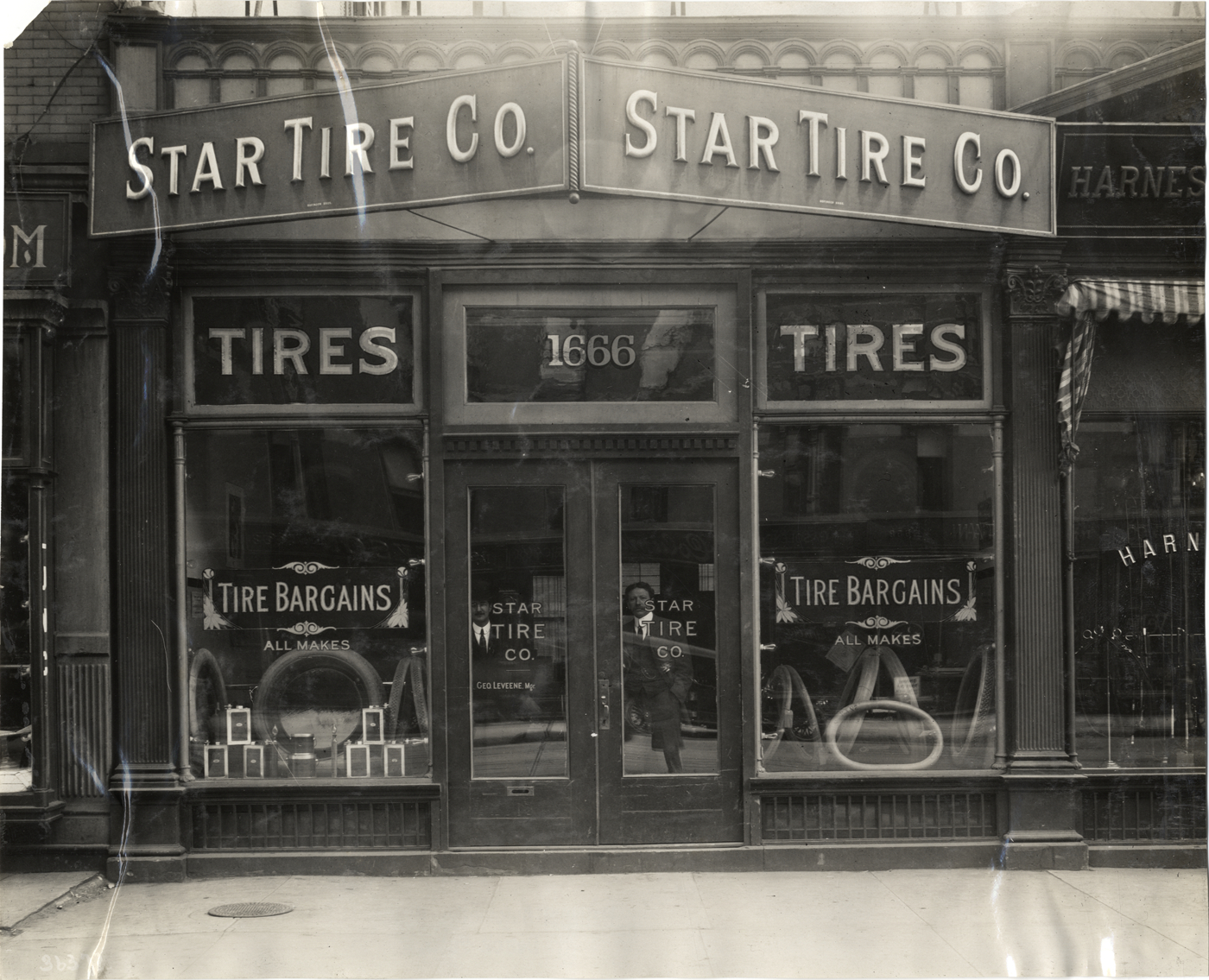 View of storefront windows of Star Tire Company store; two men visible through closed glass doors. "Star Tire Co." sign over entrance; "Tire bargains, all makes" painted in windows. "Geo. Leveene, Mgr." painted on door. Stamped on back: "Spooner & Wells, Inc., photographers, telephones 3472-3473 Columbus, 1931 Broadway, New York." Handwritten on back: "Companies--Star Tire Co., 1910."