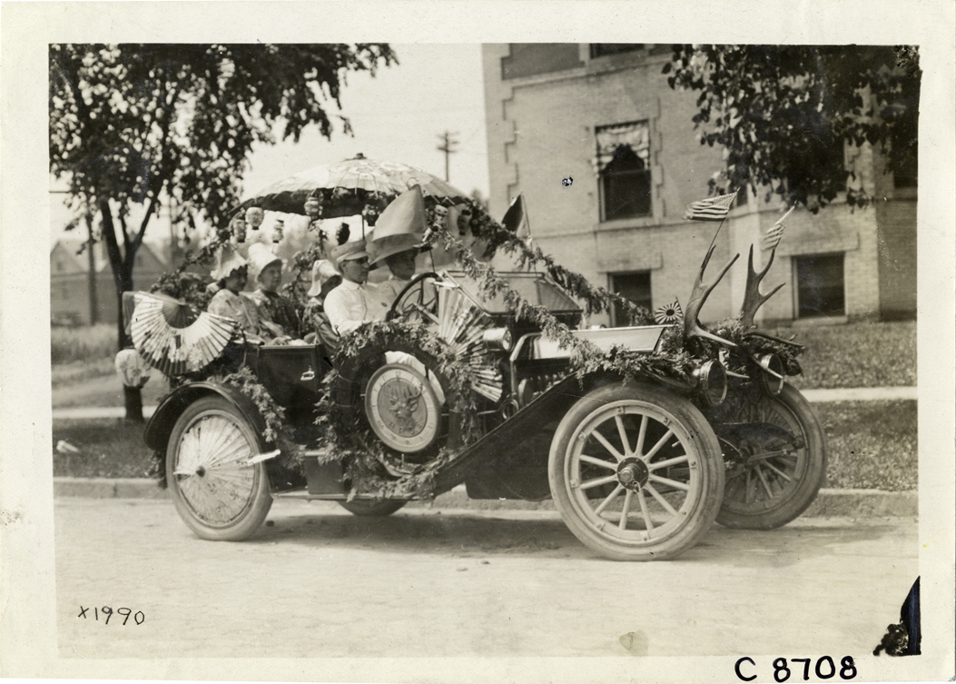 View of car in parade during Elks Club convention in Detroit, Michigan. Car is decorated with paper fans, lanterns, parasols, antlers and B.P.O.E. elk medallion. Stamped on back: "Spooner & Wells, Inc., photographers, telephone North 1745. 1231 Woodward Ave., Detroit, Mich. Detroit, 1231 Woodward, New York, 1931 Broadway." Handwritten on back: "Conventions--Elks Club Convention, 1910. Detroit, Mi."
