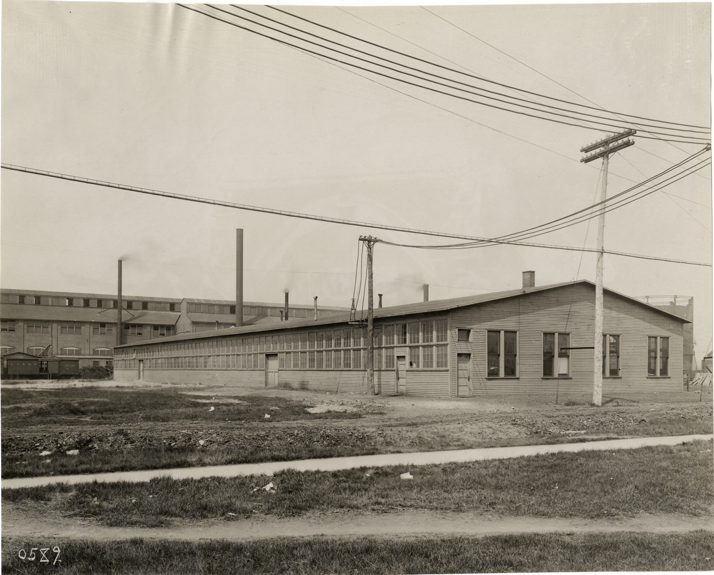 View of wooden-frame building at Sibley Motor Car Company factory. Handwritten on back: "Companies--Sibley Motor Car Co., 1910. Sibley factory."
