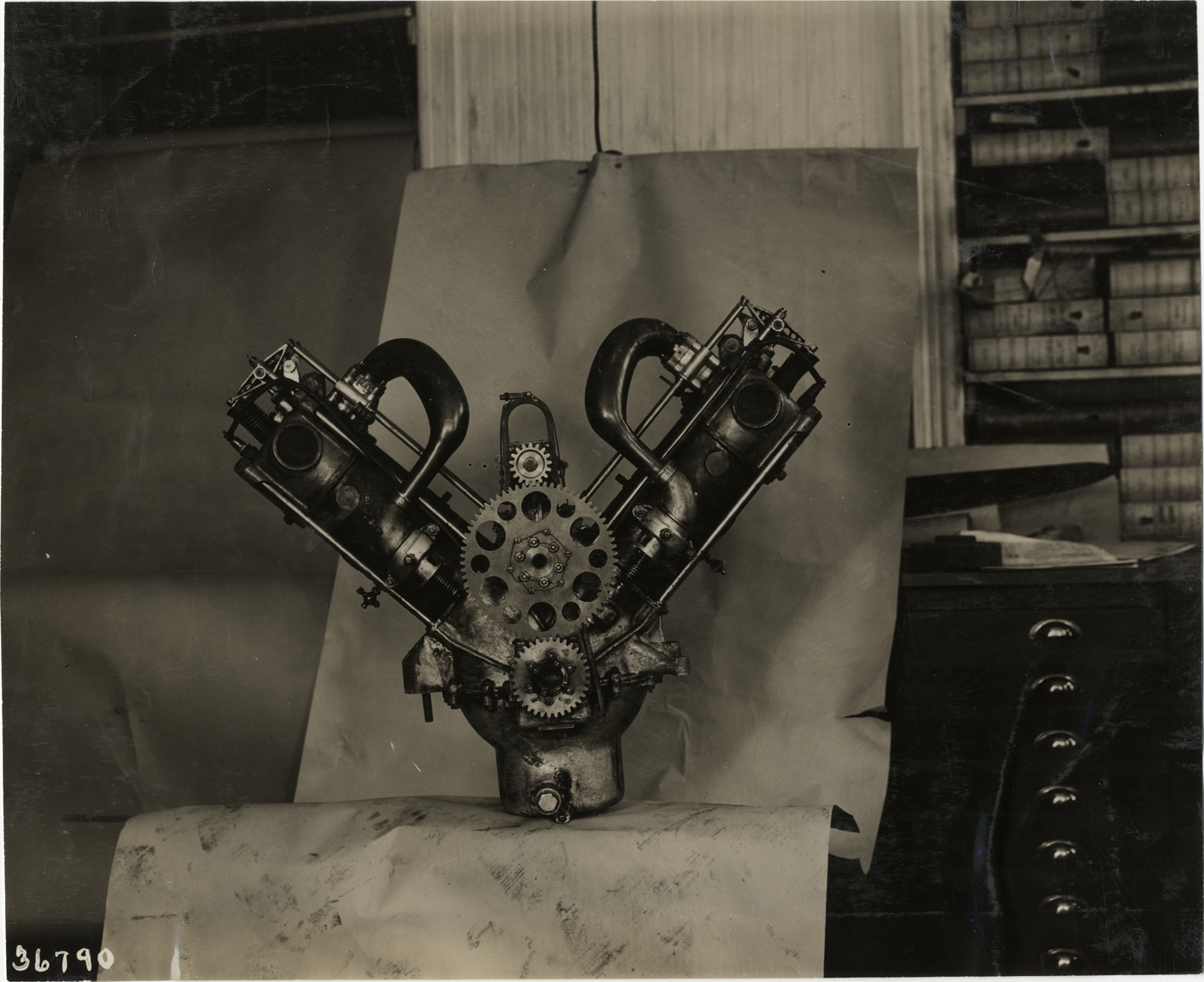 View of car engine on backdrop; bookshelves in background. Stamped on back: "Spooner & Wells, Inc., photographers, telephones 3472-3473 Columbus, 1931 Broadway, New York." Handwritten on back: "Engines--Unidentified, 1910."