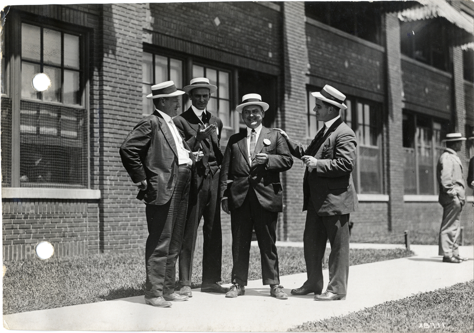 View of four men standing in front of Hupp Motor Car Company factory during Hupmobile Dealers' Convention. Handwritten on back: "Dealerships--Hupmobile. Hupmobile Dealers' Convention."