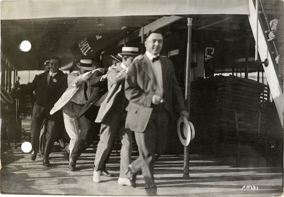 View of men dancing in single file on ferry during Hupmobile Dealers' Convention. Handwritten on back: "Dealerships--Hupmobile. Hupmobile Dealers' Convention."