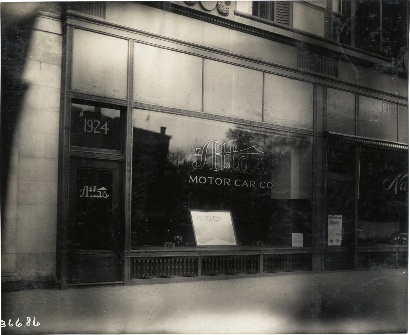 View of Atlas Motor Car Company store. Handwritten on back: "Dealerships--Atlas, 1910."