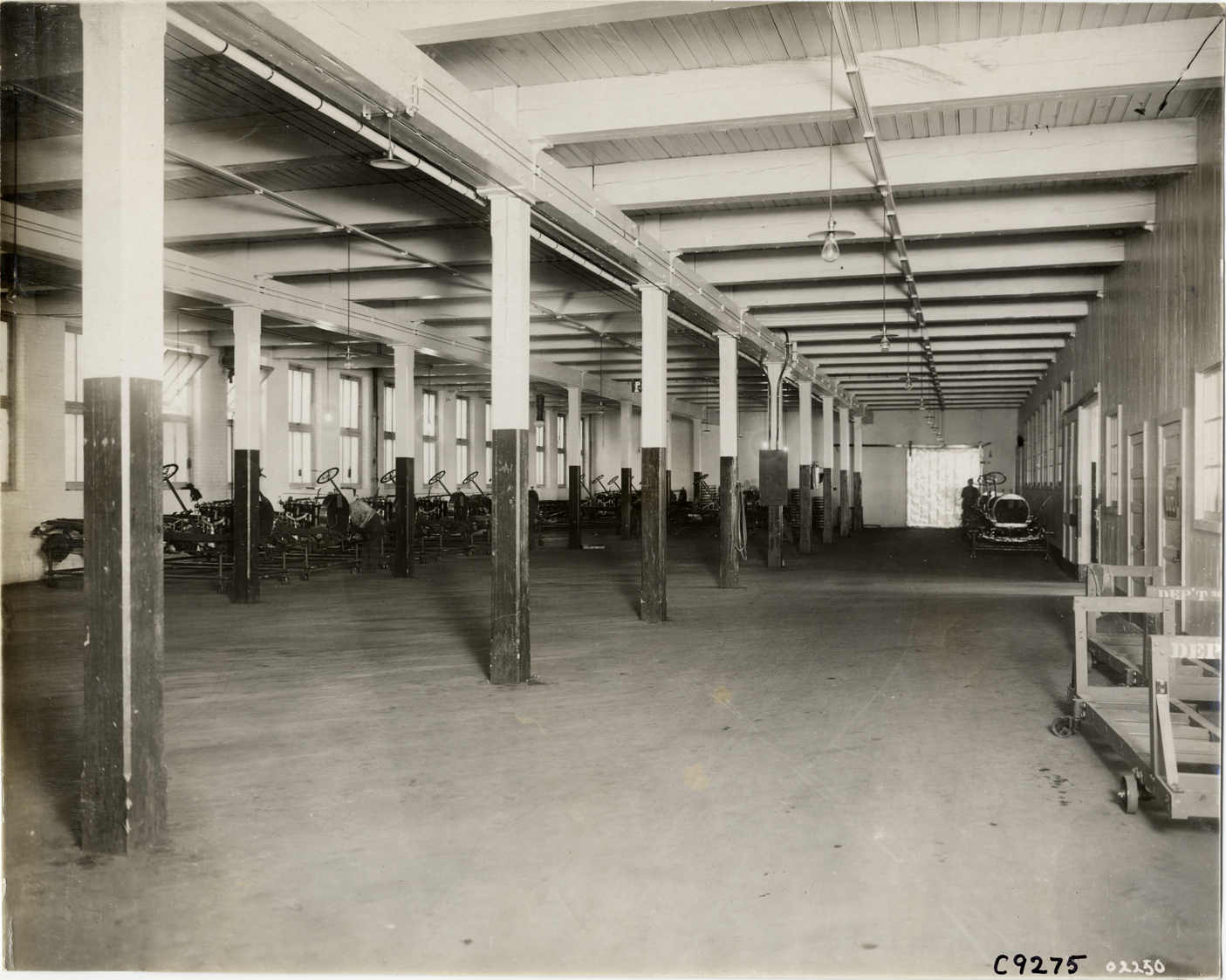 View of interior of Marquette Motor Company factory; automobile chassis in room. Stamped on back: "Spooner & Wells, Inc., photographers, 1231 Woodward Ave., Detroit, Mich., telephone North 1745." Handwritten on back: "Factories--Marquette Motor Co., 1911. Saginaw, Mich."