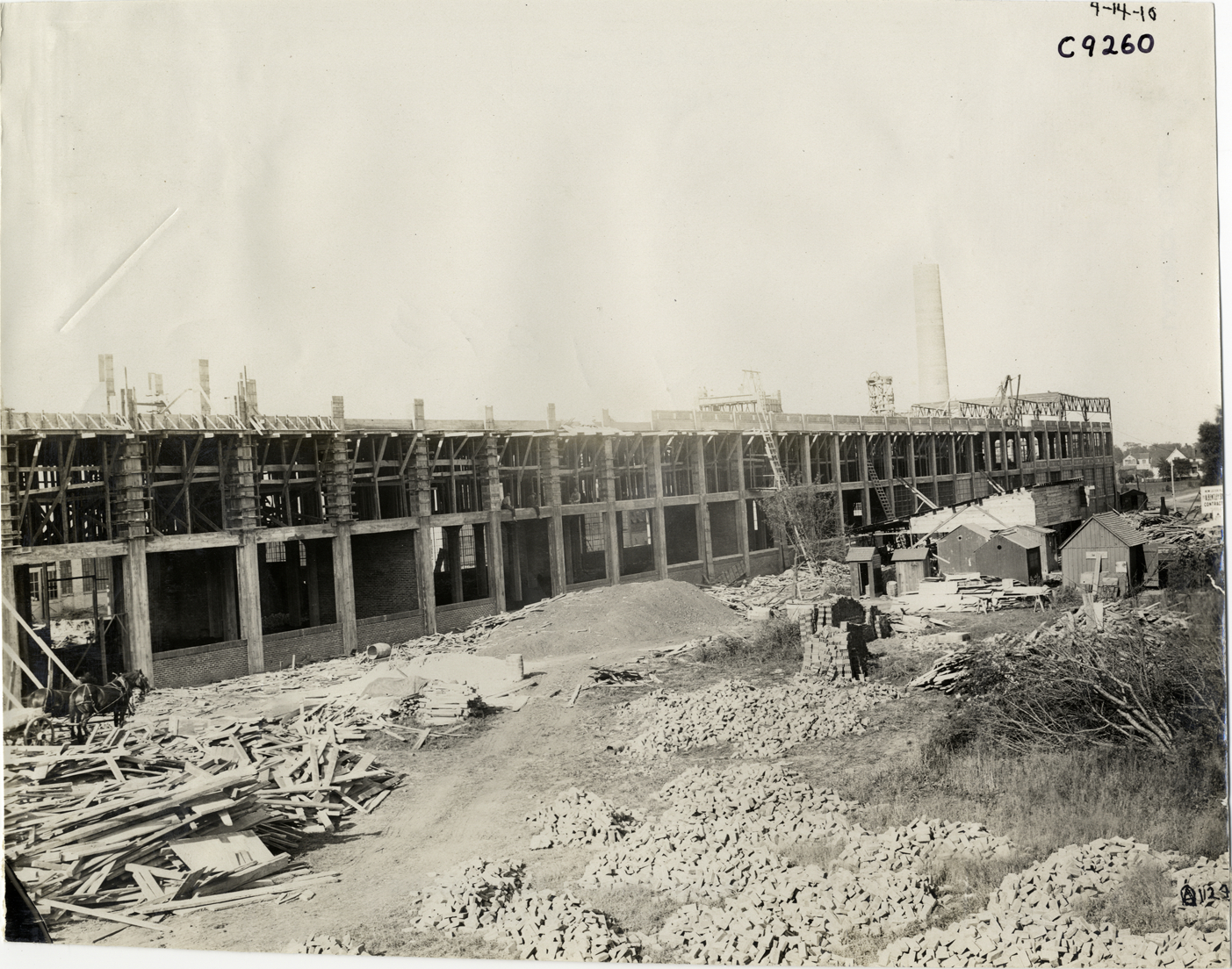 View of Lozier Motor Company factory during construction, showing building framework. Construction materials and debris in foreground; outbuildings in background. Handwritten on front: "9-14-10." Handwritten on back: "Factories--Lozier, 1910."