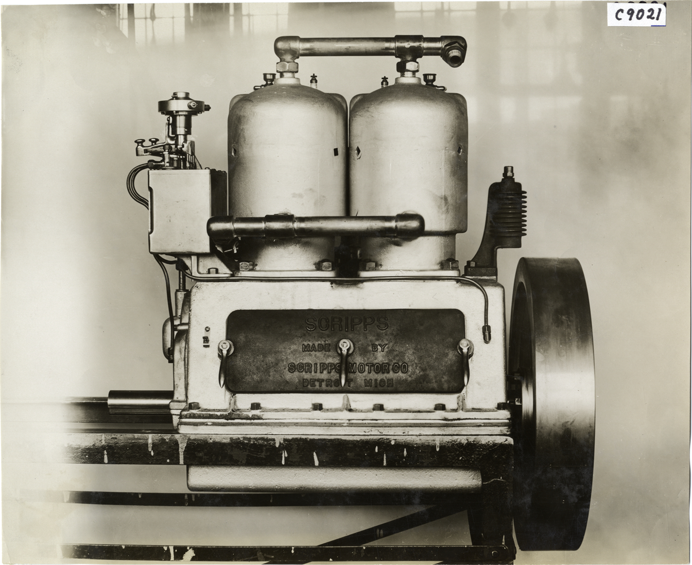 View of Scripps marine engine. Embossed on side of engine: "Scripps, made by Scripps Motor Co., Detroit, Mich." Handwritten on back: "Engines--Scripps, 1910."