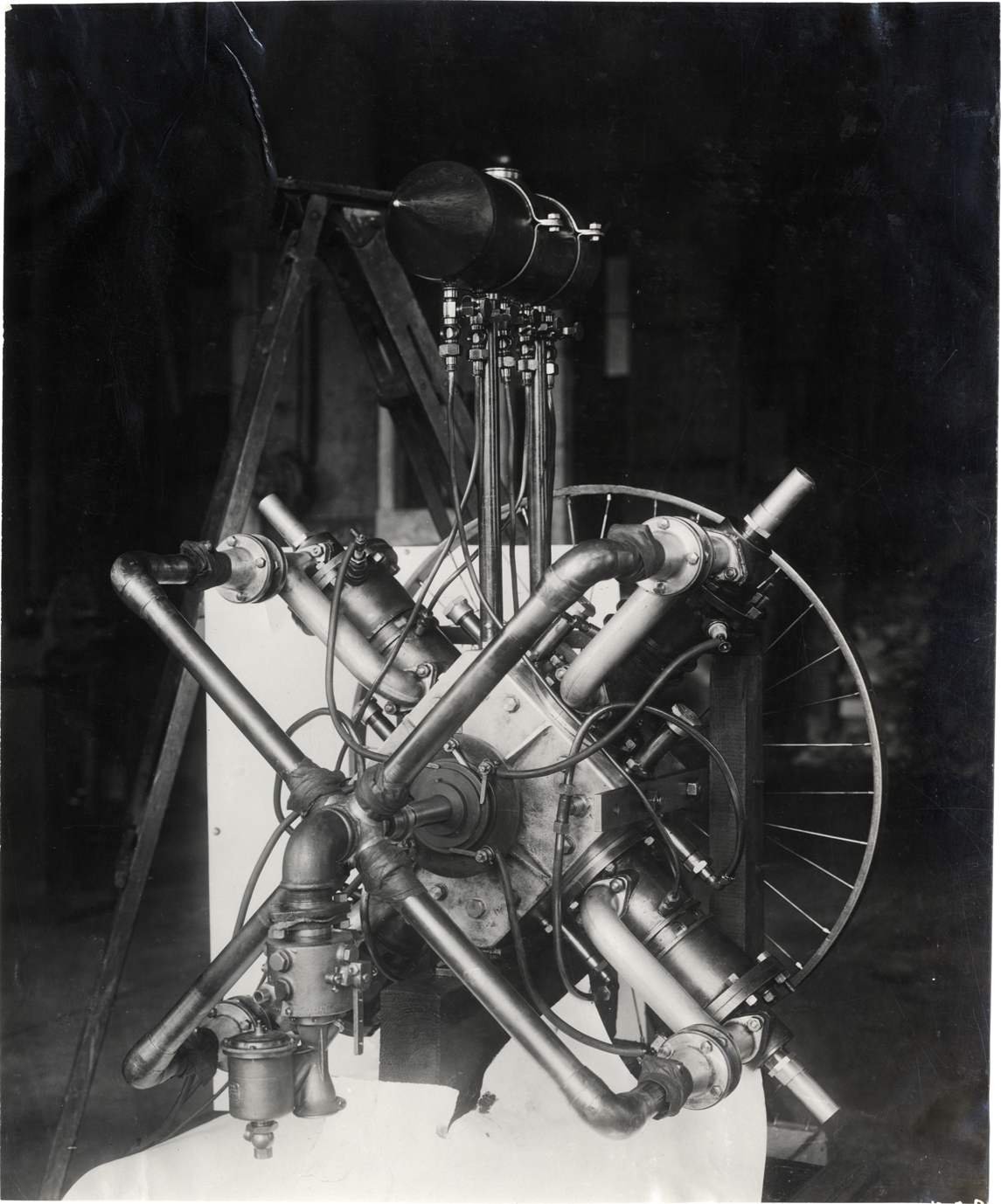 View of car engine. Handwritten on back: "Engines--Unidentified, 1910."