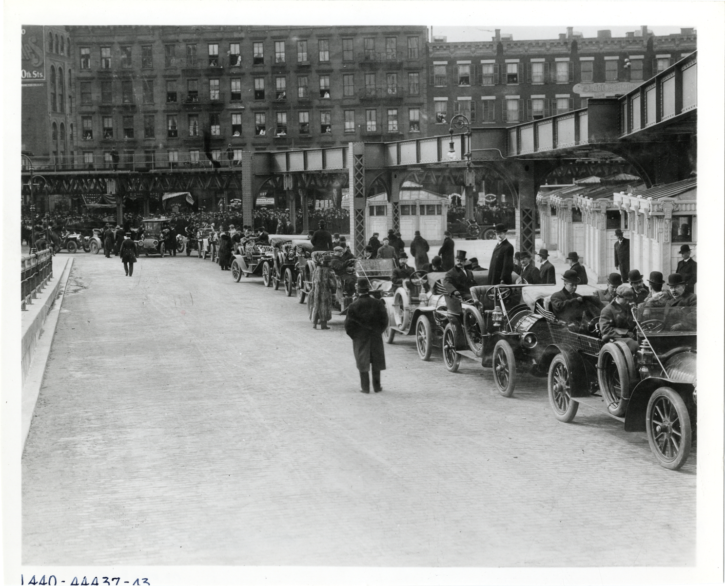 View of row of cars and drivers waiting in street; buildings in background. Handwritten on back: "Events--Unidentified."