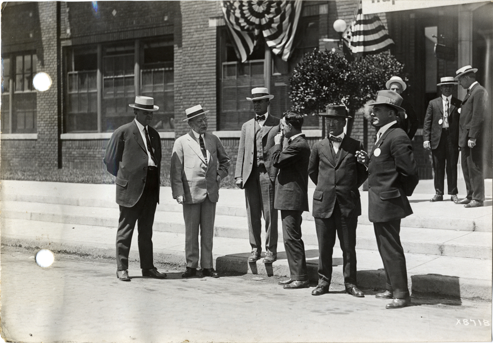 View of several men standing in front of Hupp Motor Company factory during Hupmobile Dealers' Convention. Handwritten on back: "Dealerships--Hupmobile. Hupmobile Dealers' Convention."