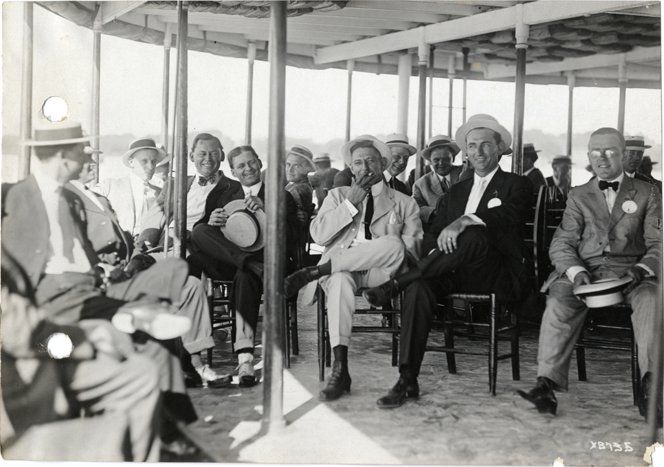 View of group of men sitting in chairs on ferry during Hupmobile Dealers' Convention. Stamped on back: "Spooner & Wells, Inc., photographers, 1231 Woodward Ave., Detroit, Mich." Handwritten on back: "Dealerships--Hupmobile. Hupmobile Dealers' Convention."