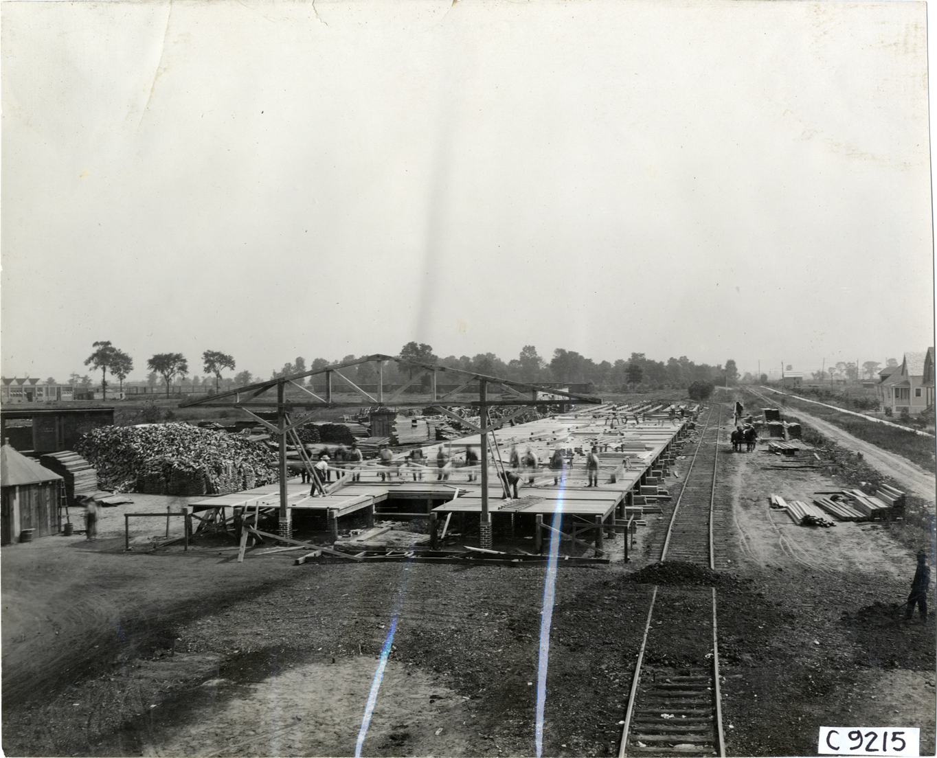 View of workers constructing Ford Motor Company factory addition; railroad tracks on right. Handwritten on back: "Factories--Ford Motor Co., 1911."