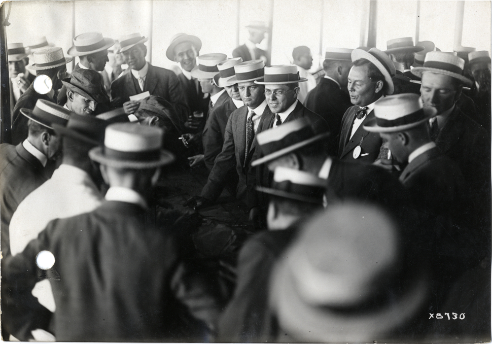 View of men on ferry during Hupmobile Dealers' Convention. Stamped on back: "Spooner & Wells, Inc., photographers, 1231 Woodward Ave., Detroit, Mich." Handwritten on back: "Dealerships--Hupmobile. Hupmobile Dealers' Convention."
